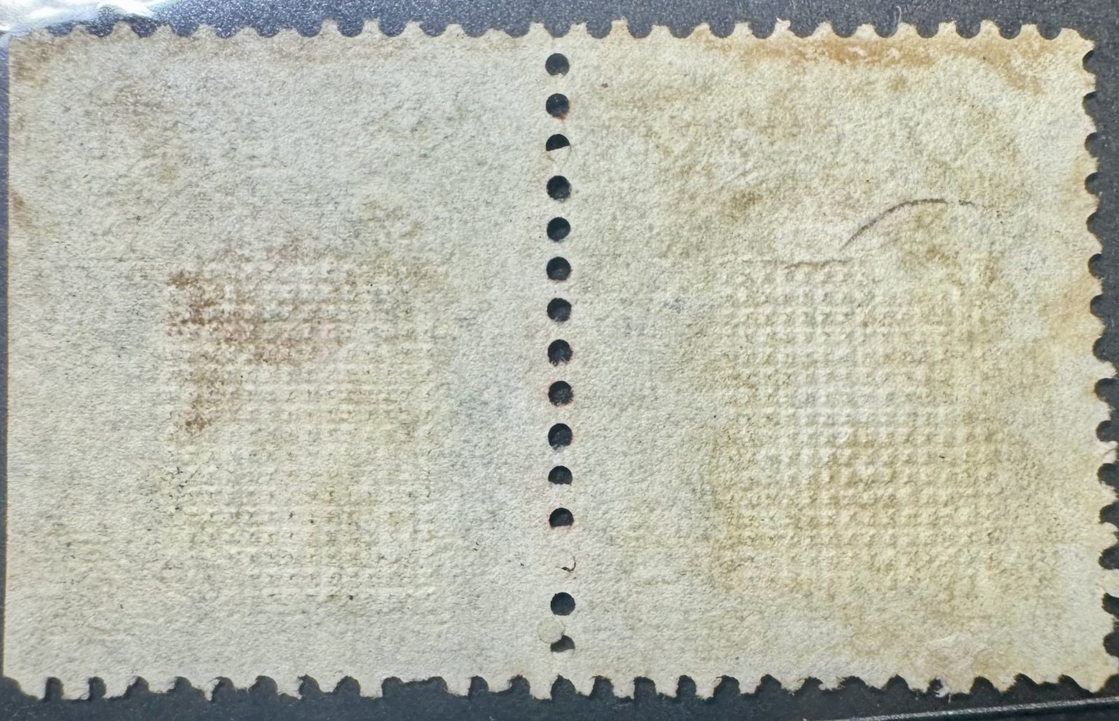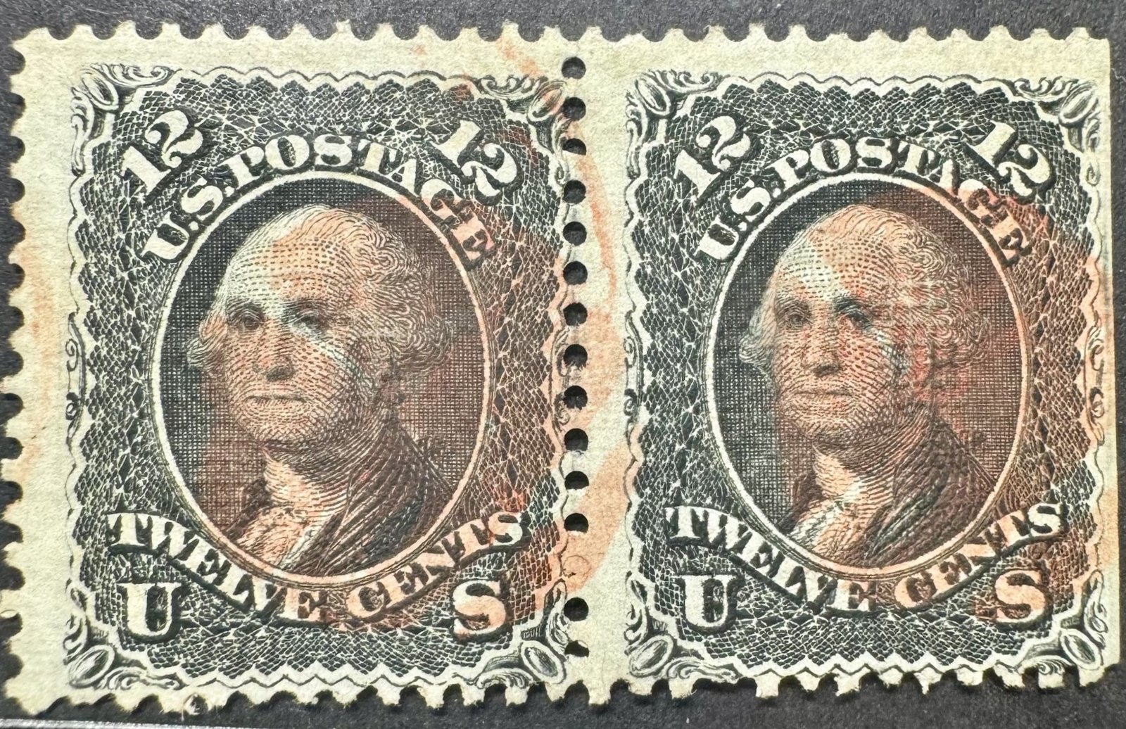 This authentic U.S. 12¢ George Washington stamp pair features two adjoining stamps with intact center perforations, making it a desirable piece for classic American philately collectors. The iconic engraved portrait of George Washington represents an important era in United States postal history.