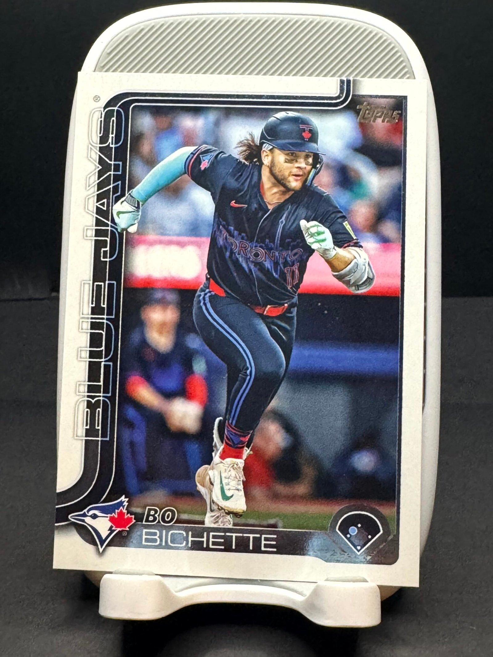 This Bo Bichette Topps Toronto Blue Jays card captures the explosive talent and intensity of one of baseball’s most exciting infielders. Featuring an in-game action image, the card highlights Bichette’s aggressive baserunning and athletic presence that has made him a cornerstone of the Blue Jays lineup.