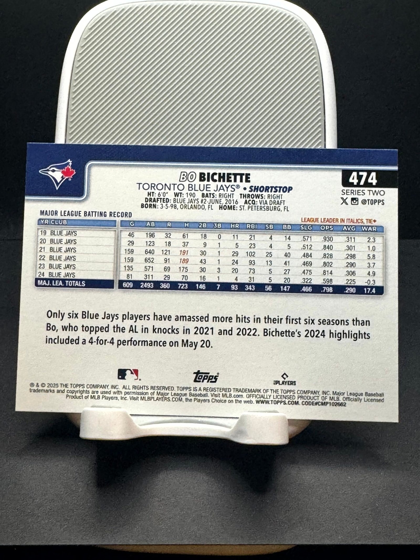 The reverse side provides detailed career and season statistics, offering collectors a deeper look into Bichette’s performance at the Major League level. With clean Topps design, official MLB licensing, and strong visual appeal, this card is a solid addition for fans of modern baseball stars and Blue Jays collectors.
