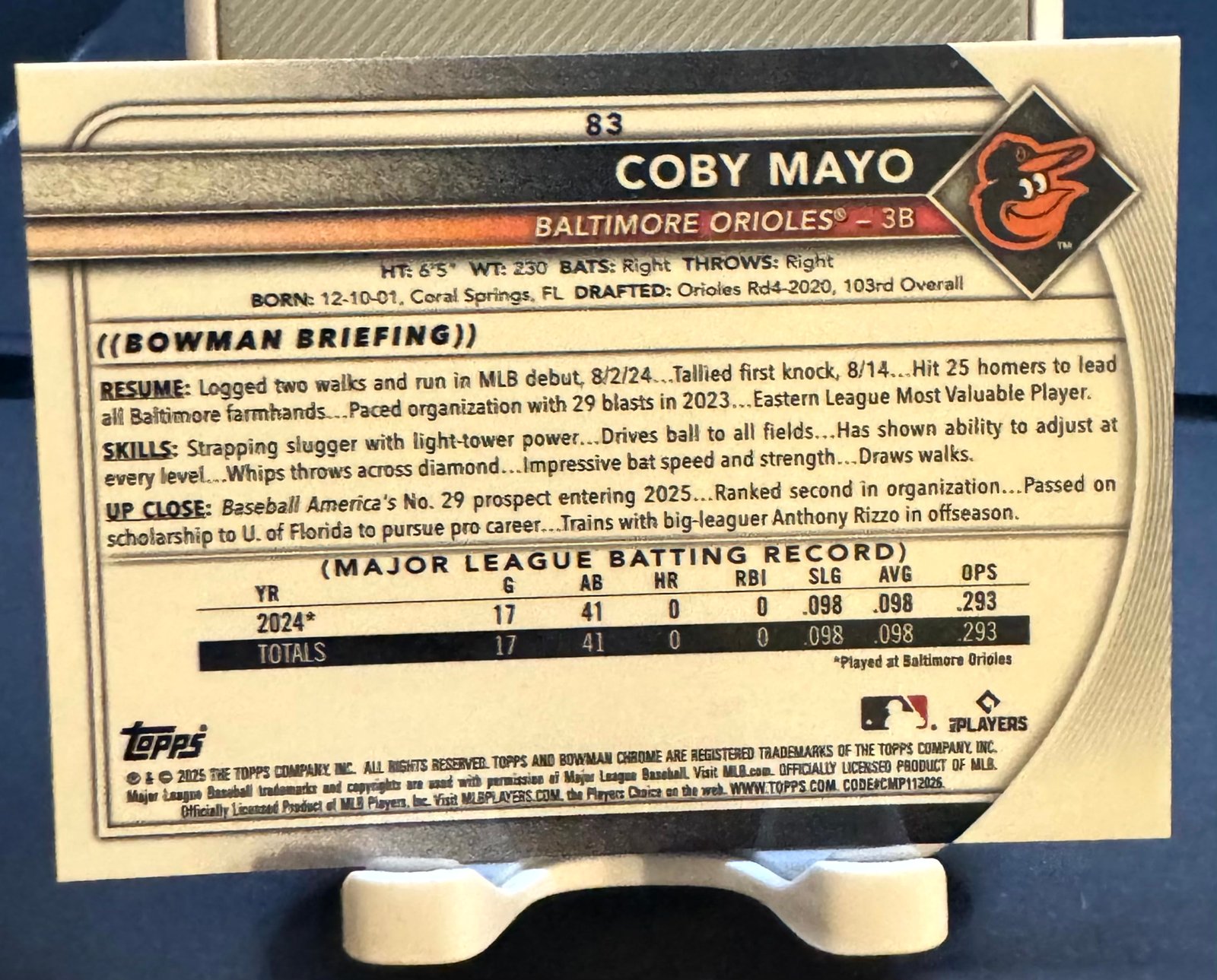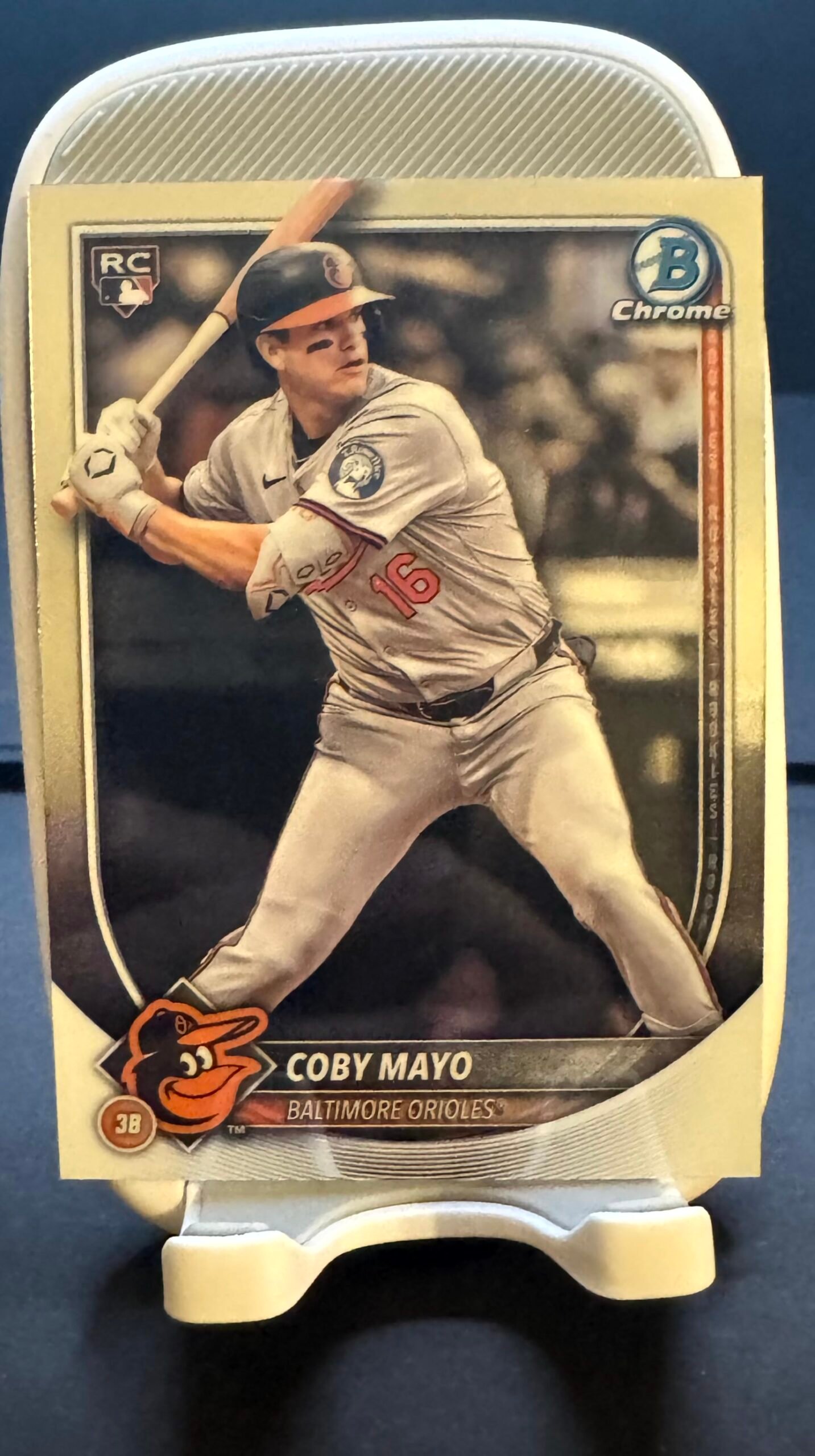 This listing features a Bowman Chrome Rookie Card (RC) of Coby Mayo, depicting the Baltimore Orioles third baseman in an in-game batting pose. Known for his raw power and strong offensive upside, Mayo has quickly become a name to watch within the Orioles organization.
