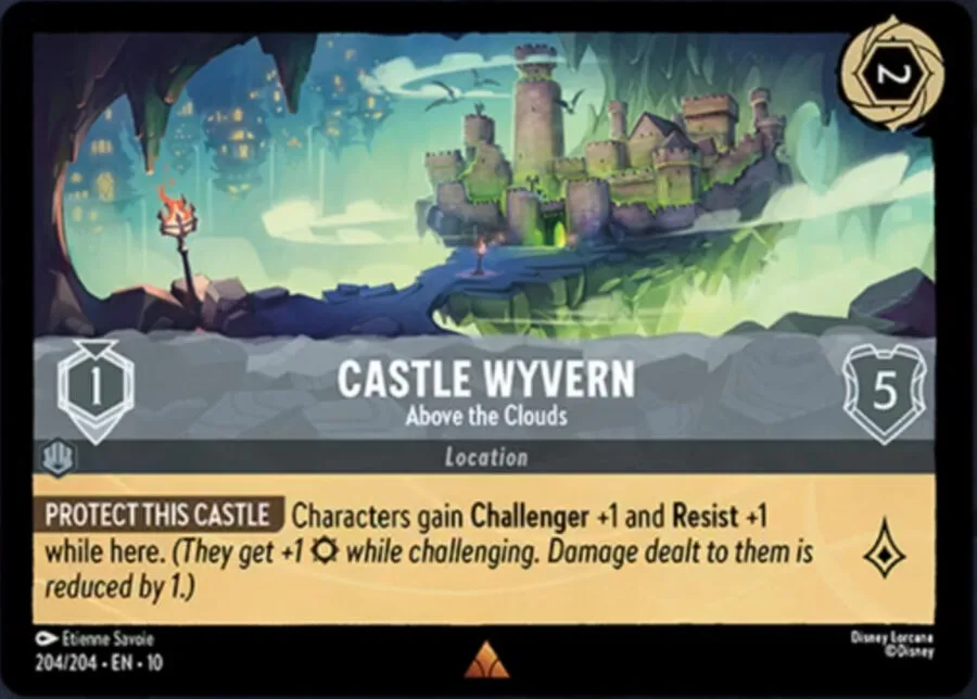 This original Disney Lorcana location card is a strategic asset for players who want to bolster the combat capabilities of their characters while maintaining a strong defensive foothold. The card features a breathtaking illustration of the iconic Castle Wyvern, the legendary fortress from Gargoyles. It is depicted resting atop a floating stone island surrounded by swirling clouds and waterfalls of light, perfectly capturing the mystical nature of the Shimmering Skies.