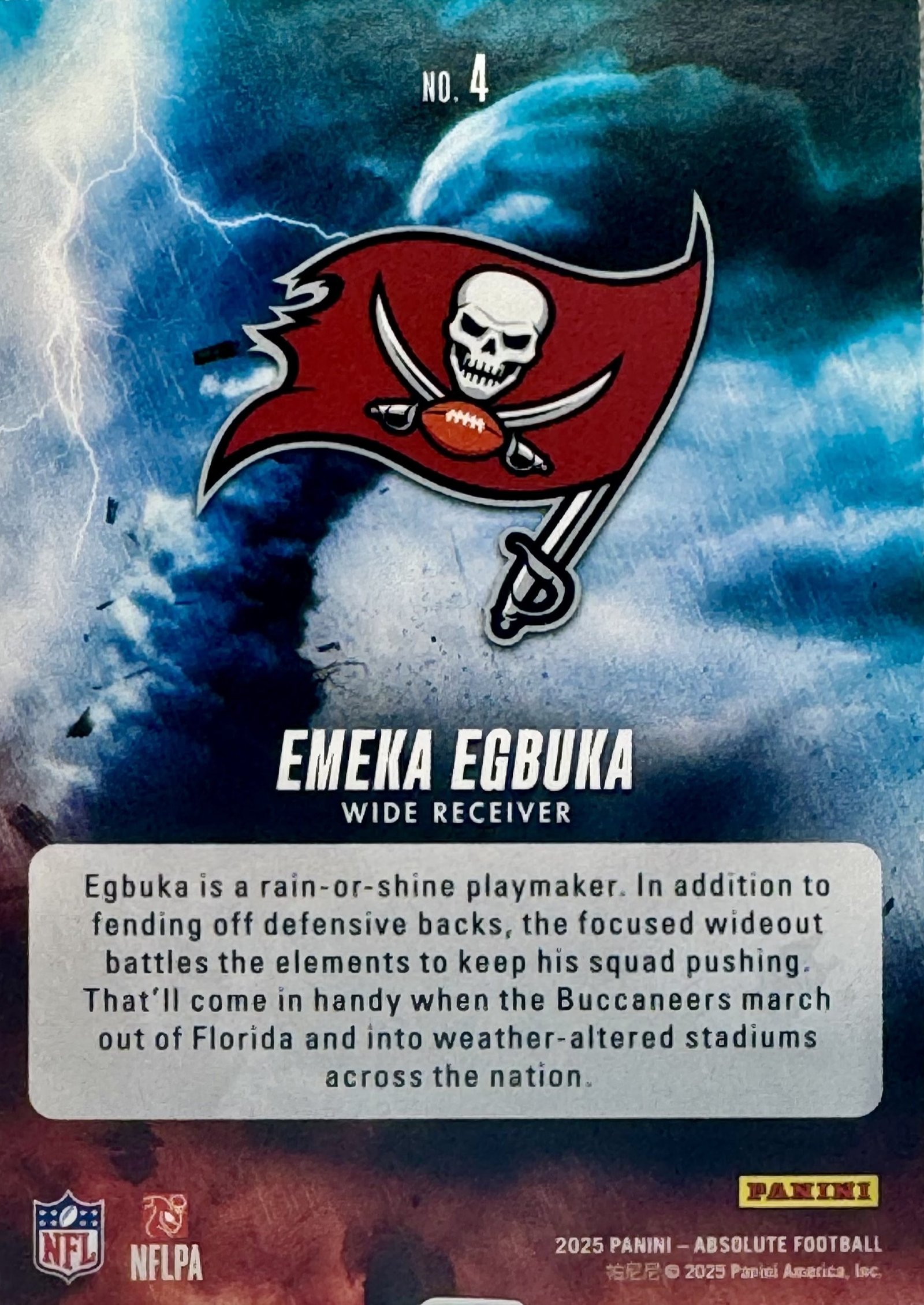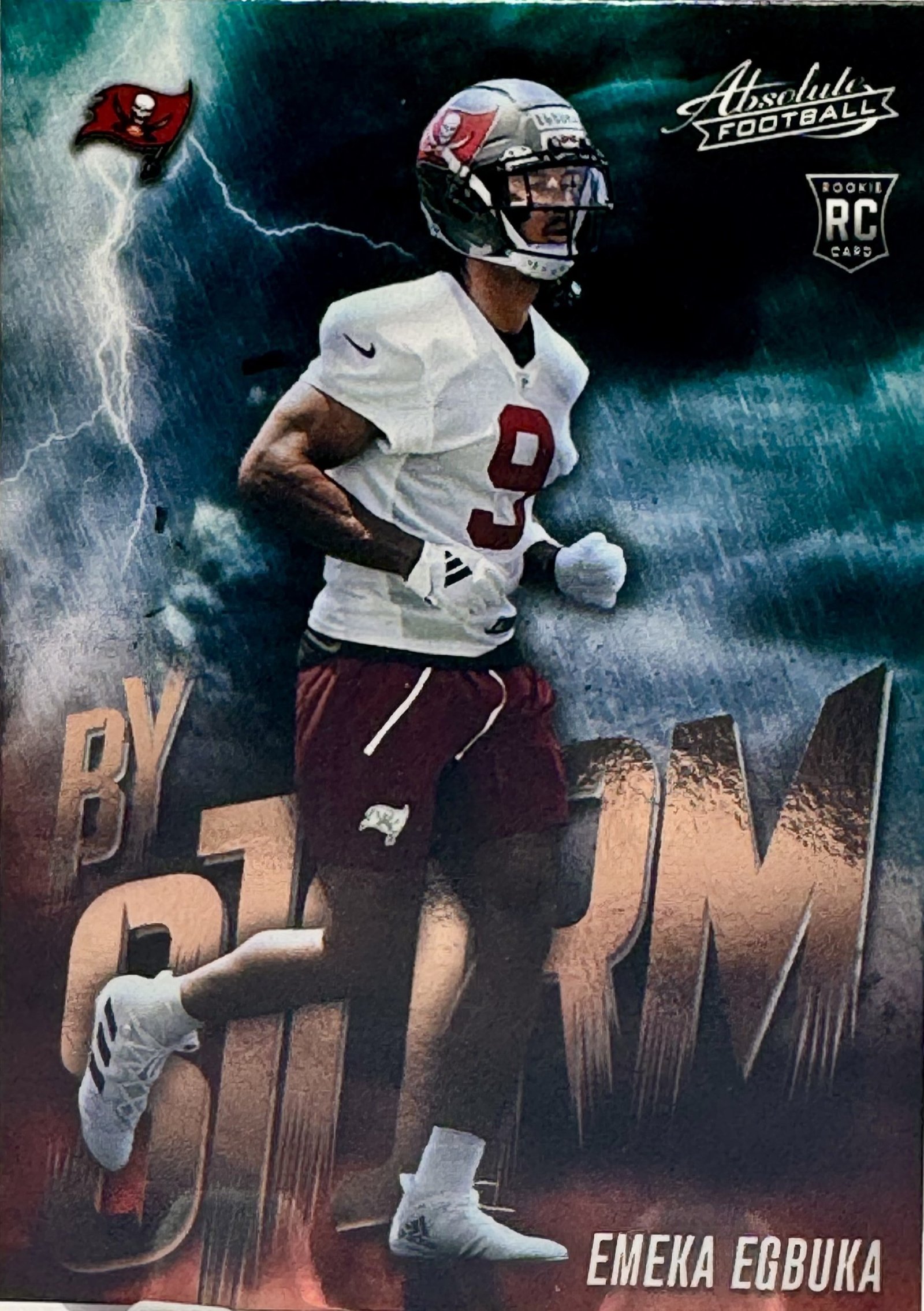 This Emeka Egbuka Rookie Card from Panini Absolute Football highlights one of the most exciting young wide receivers entering the NFL. Featuring a striking storm-inspired background and bold “By Storm” artwork, this card captures Egbuka’s speed, strength, and all-weather playmaking ability.