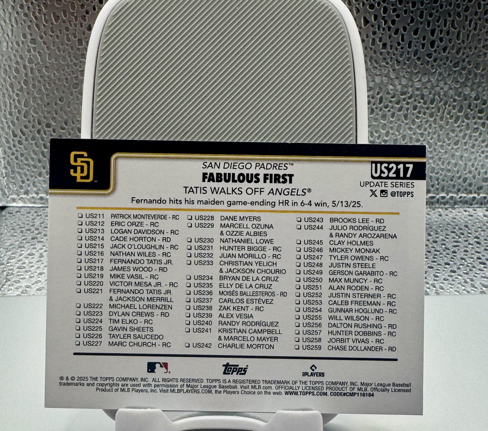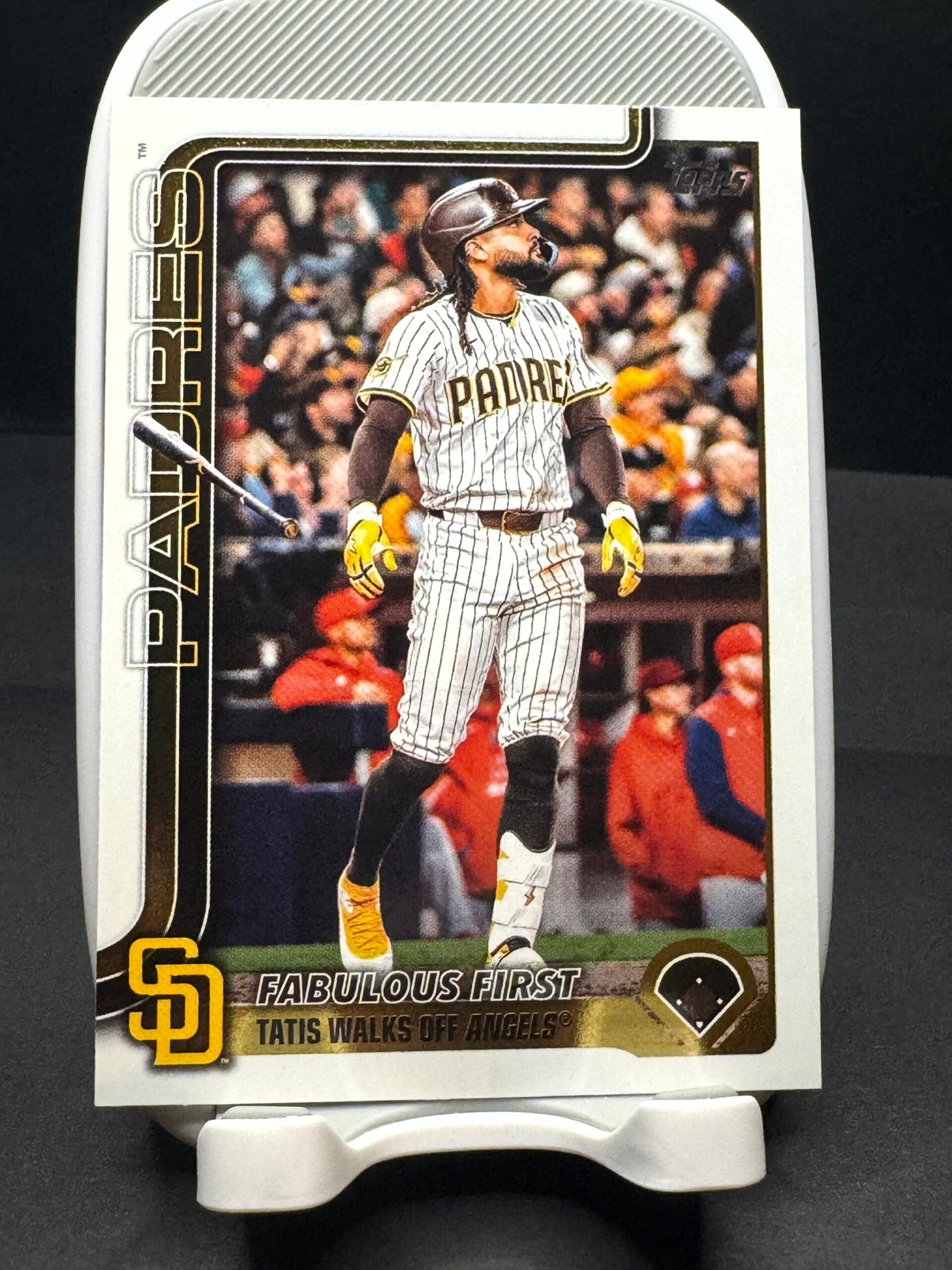 Celebrate a milestone moment in modern baseball with this Fernando Tatís Jr. – Fabulous First card from Topps Update Series (US217). This card highlights Tatís Jr.’s first career walk-off home run, capturing the energy and impact of one of MLB’s most electrifying superstars.