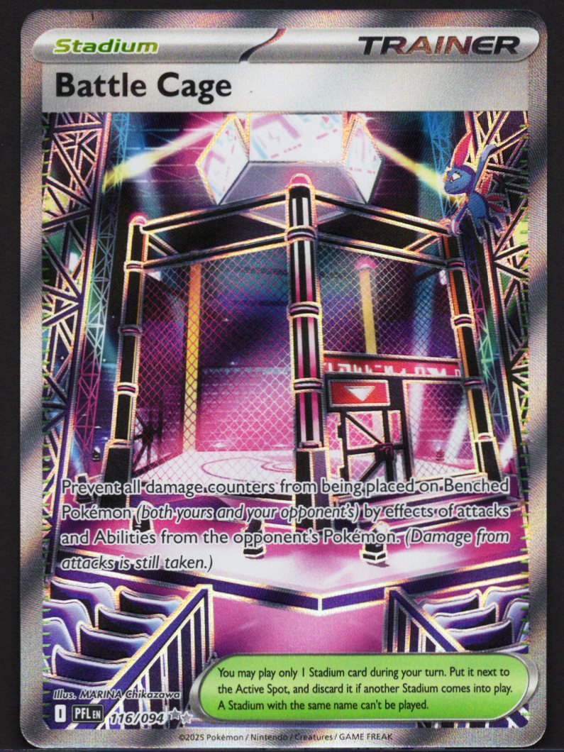 This Ultra Rare Pokémon TCG card features Battle Cage, an immersive Stadium card brought to life by the artist MARINA Chikazawa. The dynamic full-art illustration depicts a neon-lit, high-tech fighting arena, complete with towering scaffolds, floodlights, and a protective cage mesh that perfectly mirrors the card’s defensive gameplay mechanics.