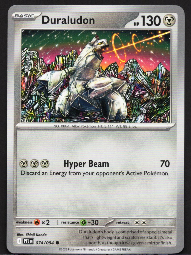 A powerful Metal-type Basic Pokémon featuring the Alloy Pokémon, Duraludon, designed to disrupt the opponent’s energy resources with a devastating beam attack.