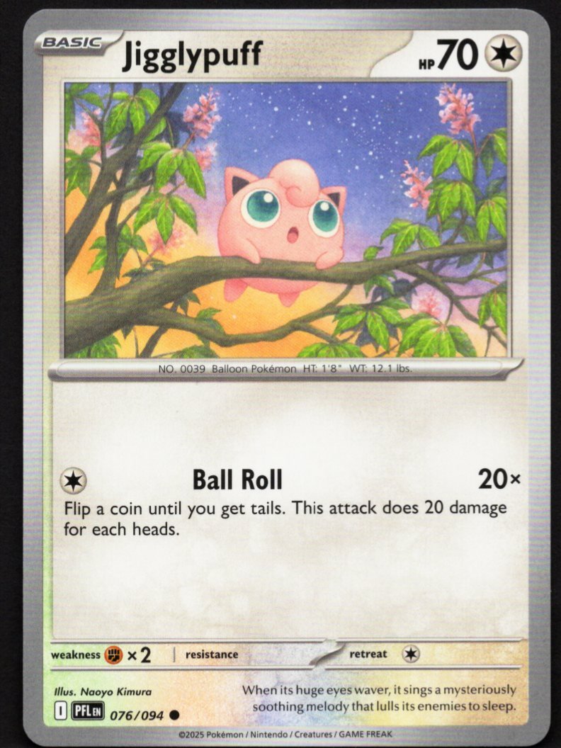 As a Basic Pokémon, Jigglypuff offers a straightforward but potentially explosive offensive option. Its primary move, Ball Roll, requires only a single Colorless energy to execute. This attack utilizes a repetitive coin-flip mechanic; the player continues to flip a coin until they receive a tails result, with the damage scaling upward for every successful heads result achieved. This allows for a massive strike that can far exceed its low energy cost with enough luck.