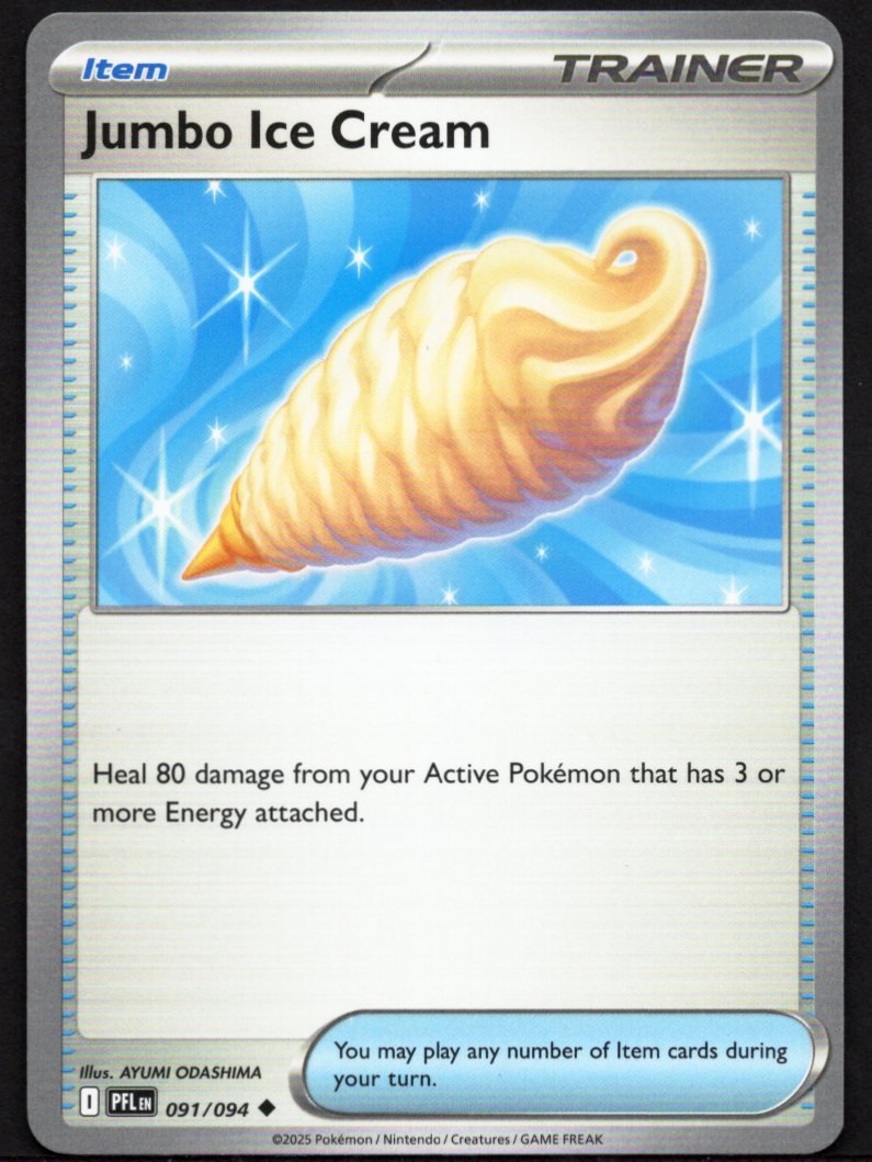 As an Item card, Jumbo Ice Cream provides essential healing utility but requires a specific energy threshold to activate. Upon use, the player may heal a substantial amount of damage from their current Active Pokémon, provided that the Pokémon has multiple energy cards attached to it. This makes it a premiere recovery tool for high-cost attackers that have already been fully set up for combat.