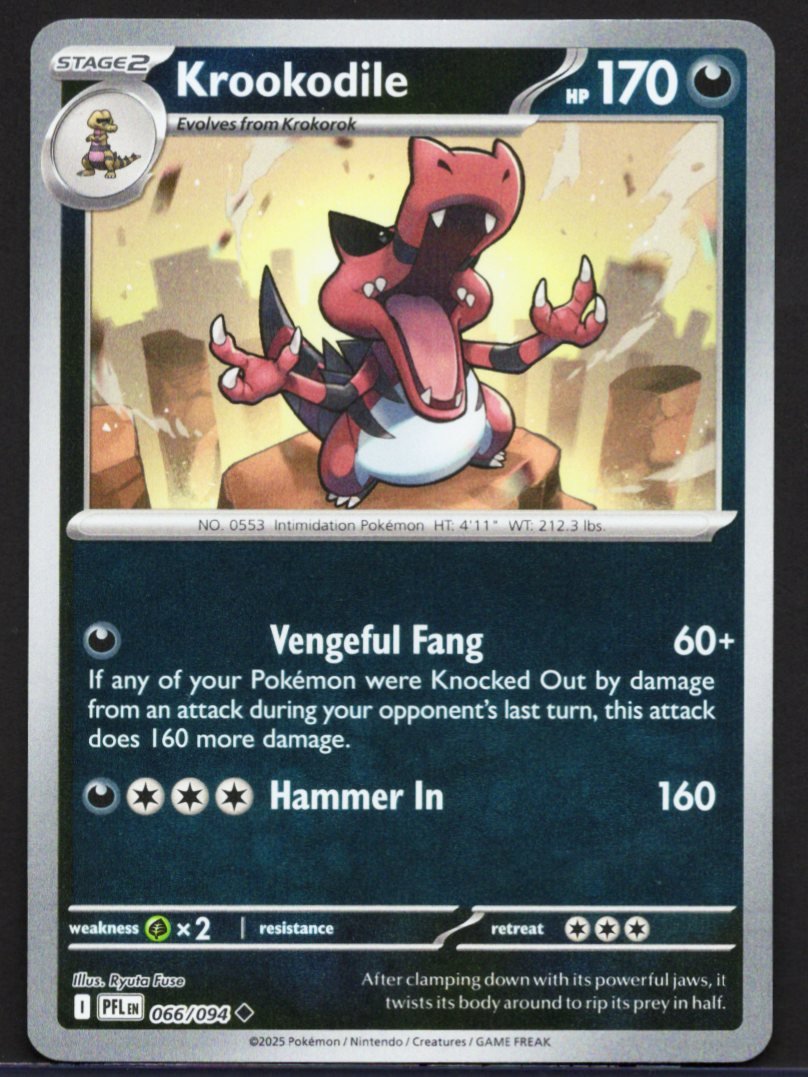 As a fully evolved Pokémon, Krookodile possesses high health and overwhelming offensive power. Its first move, Vengeful Fang, requires a single Darkness energy and becomes significantly more powerful if any of the player’s Pokémon were defeated during the opponent’s previous turn, allowing for a massive retaliatory strike. Its secondary attack, Hammer In, requires multiple Darkness and Colorless energy to deal a huge, fixed amount of damage to the opponent’s Active Pokémon.