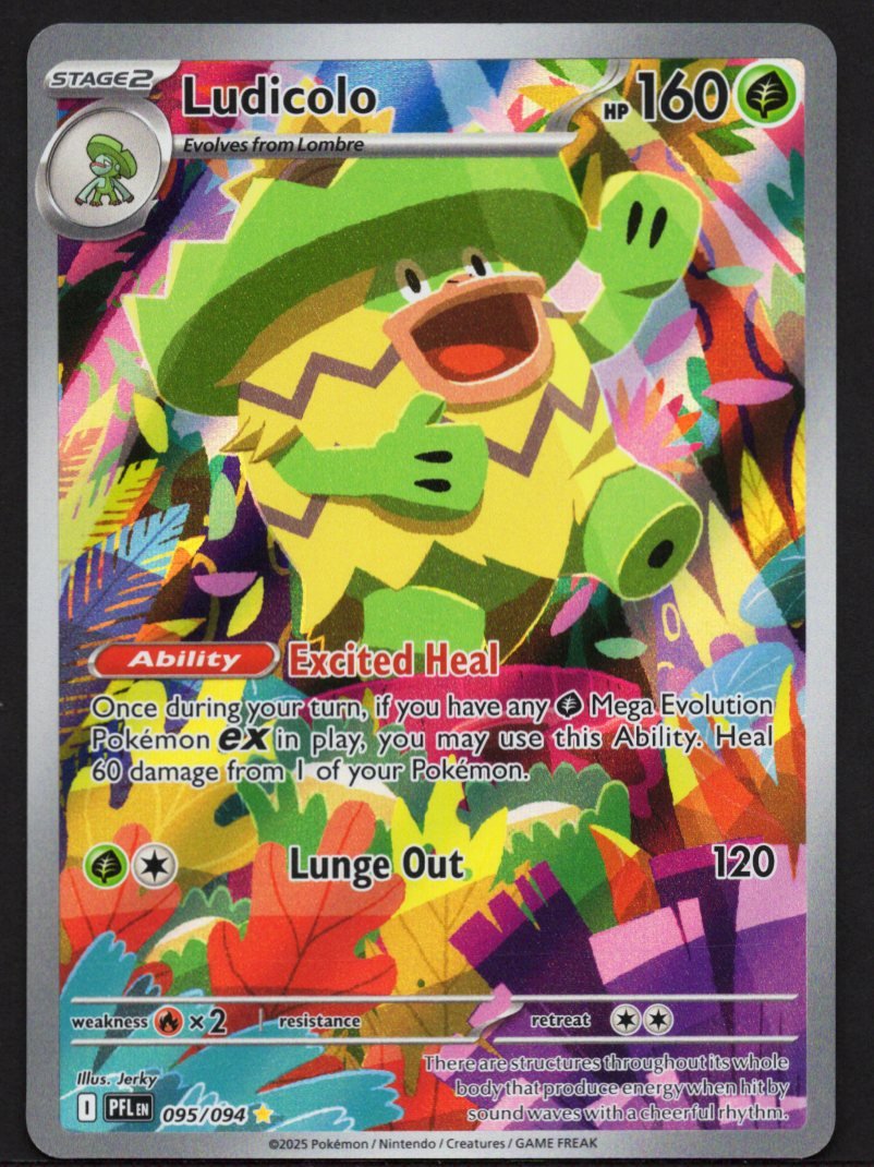 This stunning Illustration Rare Pokémon TCG card showcases Ludicolo in a breathtaking full-art display created by the artist Jerky. The artwork captures the carefree spirit of the Carefree Pokémon, depicting it in a lush, multicolored jungle environment filled with vivid tropical flora that perfectly complements its energetic personality.