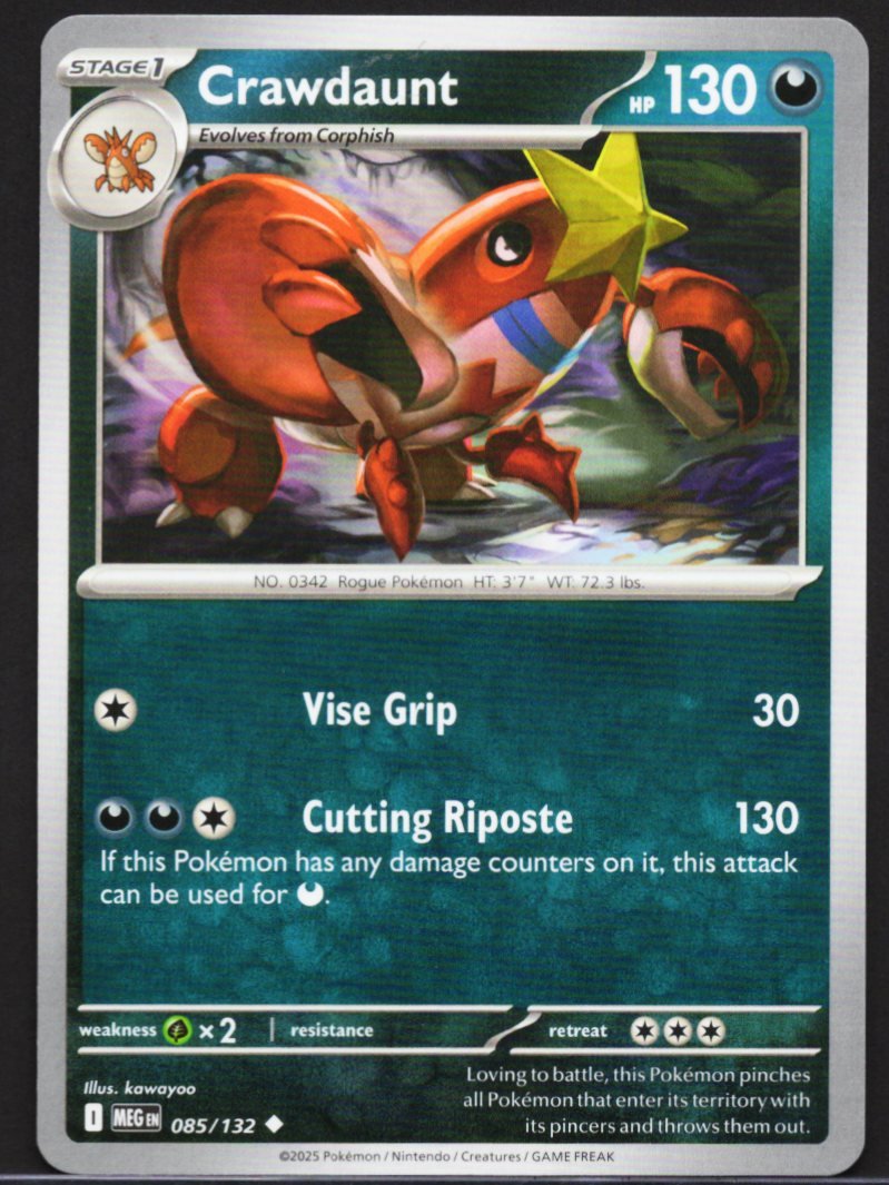 As a Darkness-type Pokémon, it utilizes a combination of brute strength and tactical retaliation. Its primary physical move, Vise Grip, allows for a direct and reliable strike against an opponent. Additionally, it can execute a devastating Cutting Riposte attack; while this maneuver typically requires multiple energy attachments, its cost is significantly reduced if Crawdaunt has already sustained damage, allowing for a rapid and efficient counter-strike. The artwork by kawayoo perfectly captures the character’s aggressive and confrontational nature, complemented by flavor text stating that it is a Pokémon that loves to battle and will use its pincers to pinch and throw out any intruders that enter its territory. The card also features standard game stats for an elite character, including a specific weakness to Grass-type attacks and a defined retreat cost.
