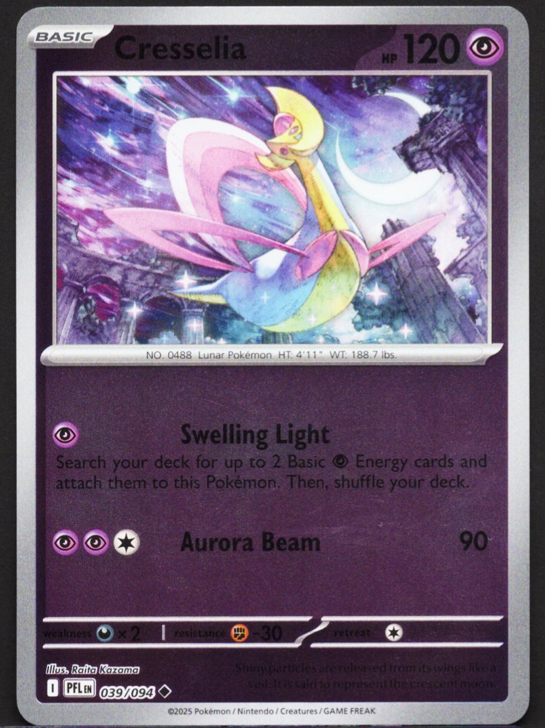 As a Psychic-type Pokémon, it excels at energy acceleration and consistent offensive pressure. Its first move, Swelling Light, allows the player to search their deck for up to two Basic Psychic Energy cards and attach them directly to Cresselia, rapidly powering it up for combat. For a primary assault, it utilizes Aurora Beam to deliver a reliable and significant amount of direct damage to the opponent’s Active Pokémon. The artwork by Raita Kazama captures the character’s celestial beauty, complemented by flavor text noting that shiny particles are released from its wings like a veil and that it is said to represent the crescent moon.