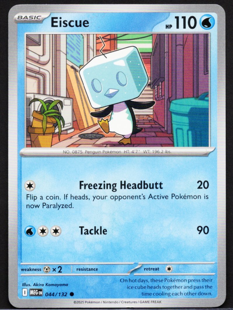 As a Water-type Pokémon, it specializes in slowing down opponents through icy physical contact. Its primary utility comes from the Freezing Headbutt move, which permits the player to flip a coin; on a successful heads result, the opponent’s Active Pokémon becomes immediately Paralyzed, preventing it from attacking or retreating during the next turn. Additionally, it can utilize a powerful Tackle for reliable direct damage. The artwork by Akira Komayama perfectly captures the character’s unique and stoic appearance, complemented by flavor text stating that on hot days, these Pokémon press their ice cube heads together to pass the time while cooling each other down. The card also features standard game stats, including a specific weakness to Metal-type attacks and a low retreat cost.