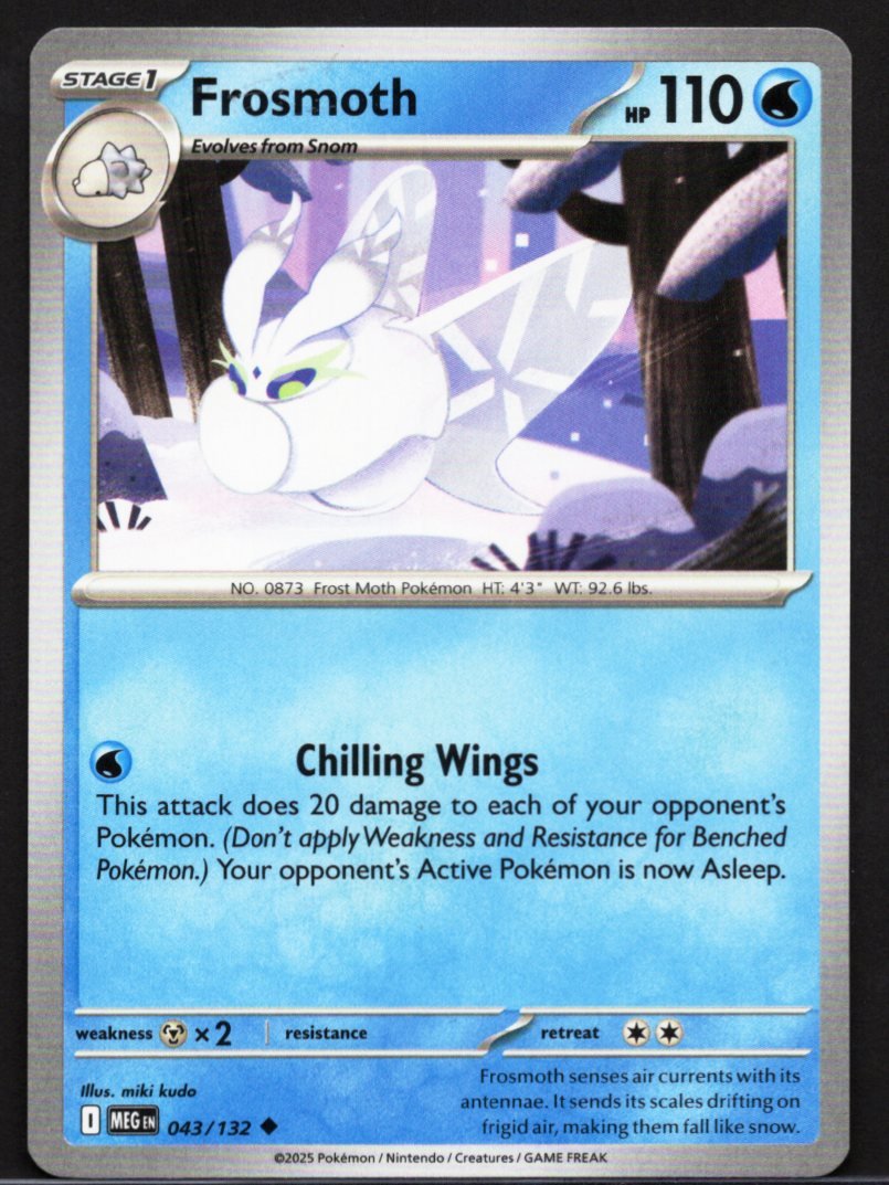 As a Water-type Pokémon, it excels at widespread crowd control and status manipulation. Its primary utility comes from the Chilling Wings attack, which deals a consistent amount of damage to every single one of the opponent’s Pokémon currently on the field. Furthermore, this move immediately leaves the opponent’s Active Pokémon suffering from the Asleep condition, forcing them to remain stationary unless they can wake up between turns. The artwork by miki kudo perfectly captures the character’s ethereal and serene nature, complemented by flavor text stating that it senses air currents with its antennae and sends its scales drifting on frigid air to make them fall like snow. The card also features standard game stats, including a specific weakness to Metal-type attacks and a defined retreat cost.