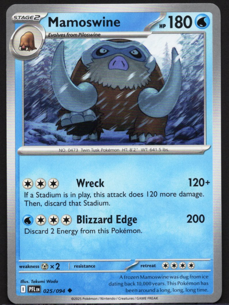 As a Water-type Pokémon, it excels at environmental destruction and overwhelming force. Its first move, Wreck, deals massive damage that increases significantly if a Stadium card is currently in play; once the attack is executed, the Stadium is immediately discarded. For a devastating elemental strike, it utilizes Blizzard Edge to deliver a crushing blow to the opposition, though the intensity of the move requires the player to discard some energy from the Pokémon. The artwork by Takumi Wada captures the character’s sheer size and power, complemented by flavor text noting that a frozen specimen was once dug up from ice dating back ten thousand years.