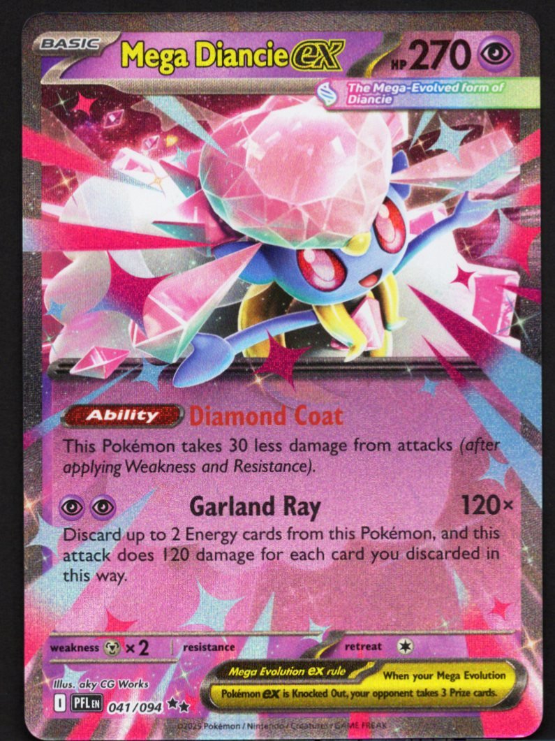 As a Psychic-type Mega Evolution Pokémon ex, it excels at defensive endurance and explosive offensive power. Its unique Diamond Coat Ability provides a constant tactical advantage by reducing the damage taken from all incoming attacks. For a devastating finishing maneuver, it utilizes Garland Ray, an attack that deals massive direct damage which scales significantly for every Energy card the player chooses to discard from the Pokémon during the strike.