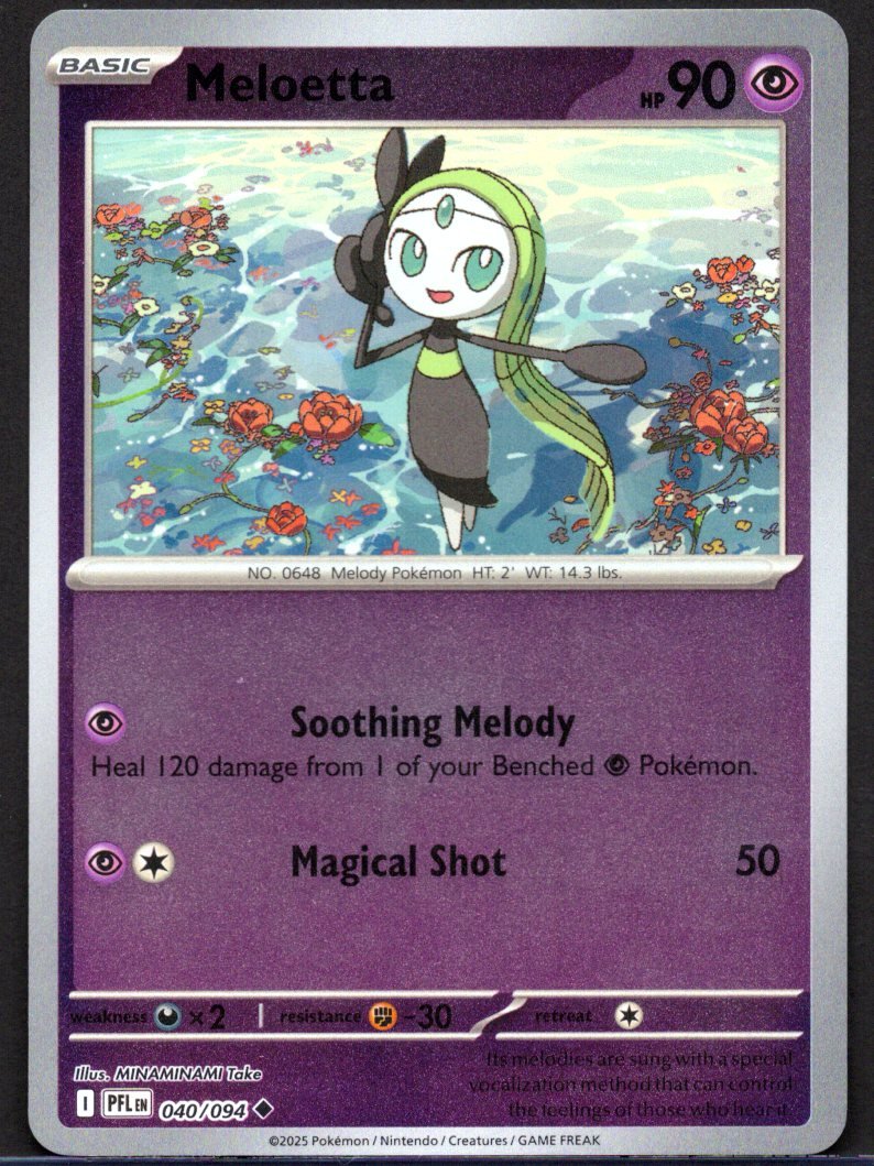 As a Psychic-type Pokémon, it excels at restorative support and reliable offensive magic. Its first move, Soothing Melody, allows the player to heal a massive amount of damage from one of their Benched Psychic-type Pokémon, keeping the team in fighting shape. For direct combat, it utilizes Magical Shot to deliver a consistent and reliable amount of damage to the opponent’s Active Pokémon. The artwork by MINAMINAMI Take captures the character’s musical essence, complemented by flavor text noting that its melodies are sung with a special vocalization method that can control the feelings of those who hear it.