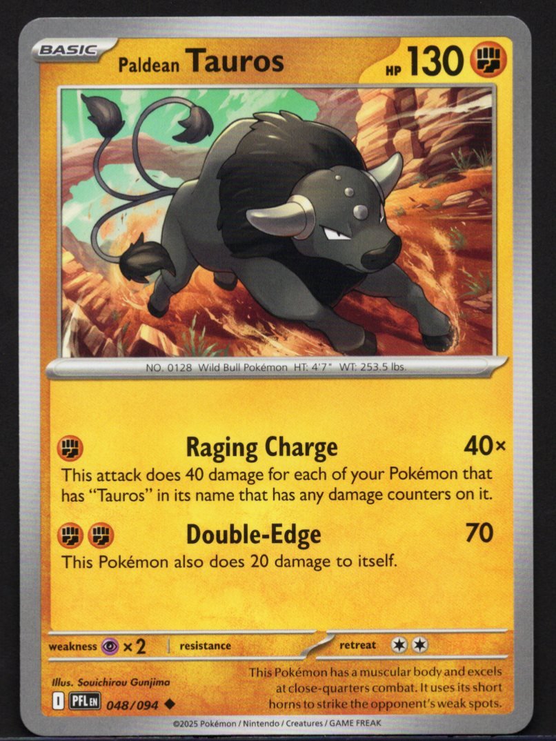 As a Fighting-type Pokémon, it excels at close-quarters combat and collective aggression. Its first attack, Raging Charge, allows the character to deliver a strike that scales significantly in power for every other Pokémon on the player’s team that shares its name and currently has damage counters on it. For a primary assault, it utilizes Double-Edge to deliver a crushing blow to the opponent’s Active Pokémon, though the force of the impact causes some recoil damage to Tauros itself. The artwork by Souichirou Gunjima captures the character’s relentless energy, complemented by flavor text noting its muscular body and its use of short horns to strike an opponent’s weak spots.