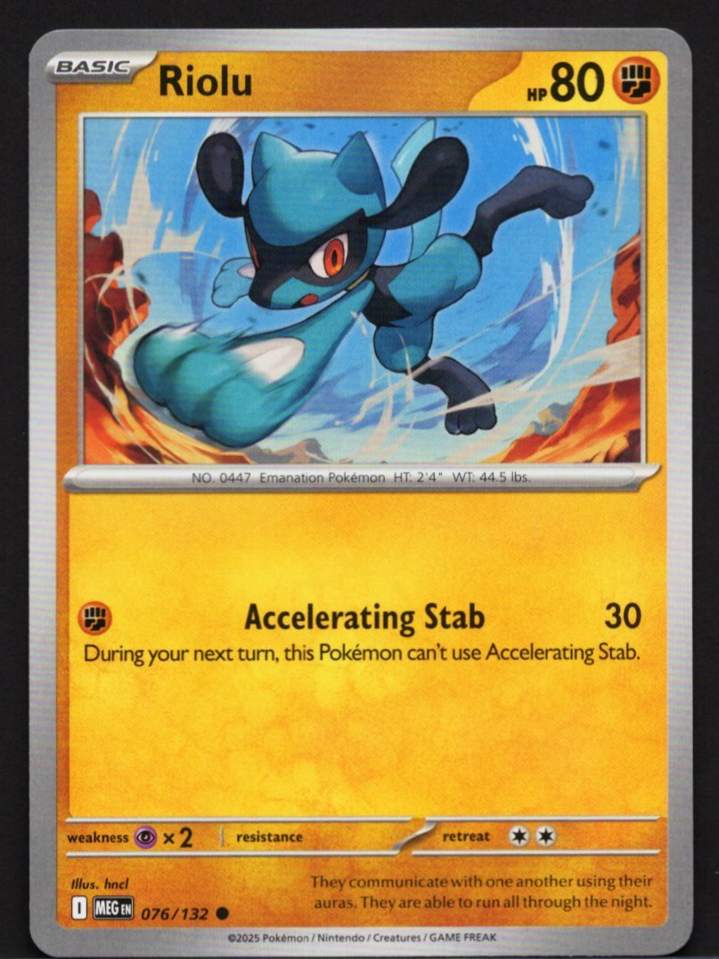 As a Fighting-type Pokémon, it relies on intense aura and physical speed to overwhelm its opponents. Its primary utility comes from the Accelerating Stab move, which deals a significant amount of direct damage; however, the intensity of the maneuver prevents the Pokémon from using the same move during the following turn. The artwork by hncl perfectly captures the character’s focused personality and combat prowess, complemented by flavor text stating that they communicate with one another using their auras and are able to run all through the night. The card also features standard game stats, including a specific weakness to Psychic-type attacks and a defined retreat cost.