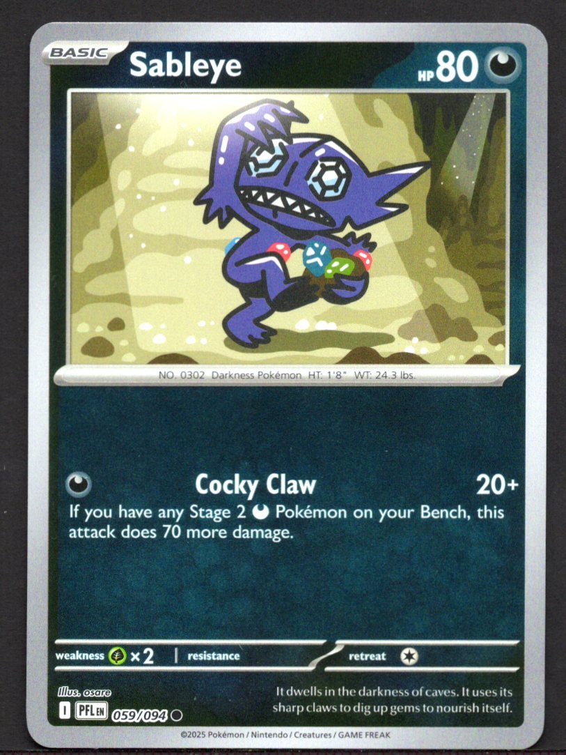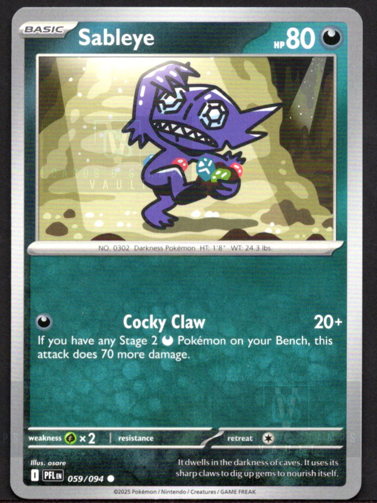 A cunning and opportunistic Darkness-type Basic Pokémon card featuring Sableye’s ability to deliver a devastating claw strike when backed by powerful benched allies.