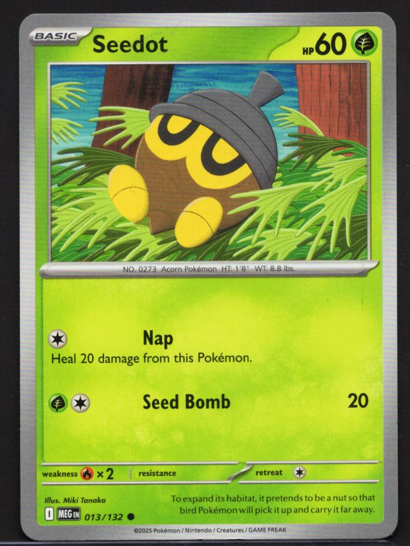 This original Pokémon TCG card features the Acorn Pokémon, Seedot, as a Basic character. The card showcases a charming and colorful illustration of the Pokémon peeking out from behind vibrant green ferns in a wooded area, with its distinct grey cap and yellow-spotted body perfectly blending into the natural environment.