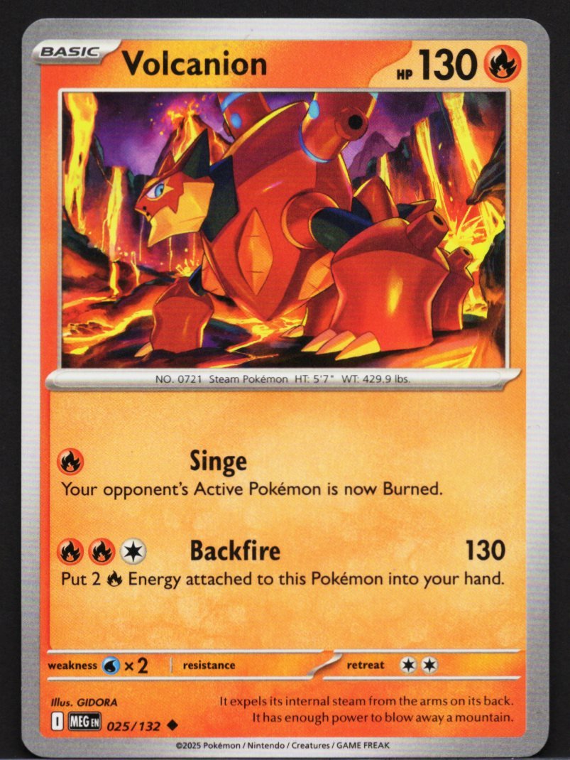 As a Fire-type Pokémon, it excels at applying persistent pressure and manipulating energy resources on the battlefield. Its primary utility comes from the Singe move, which deals immediate damage while simultaneously leaving the opponent’s Active Pokémon suffering from a Burn. Additionally, it can unleash its devastating Backfire attack, which delivers a massive physical strike but requires the player to return multiple attached Fire energy cards to their hand for future use. The artwork by GIDORA perfectly captures the raw elemental power of the character, complemented by flavor text stating that it expels internal steam from the arms on its back with enough power to blow away an entire mountain. The card also features standard game stats, including a specific weakness to Water-type attacks and a defined retreat cost.
