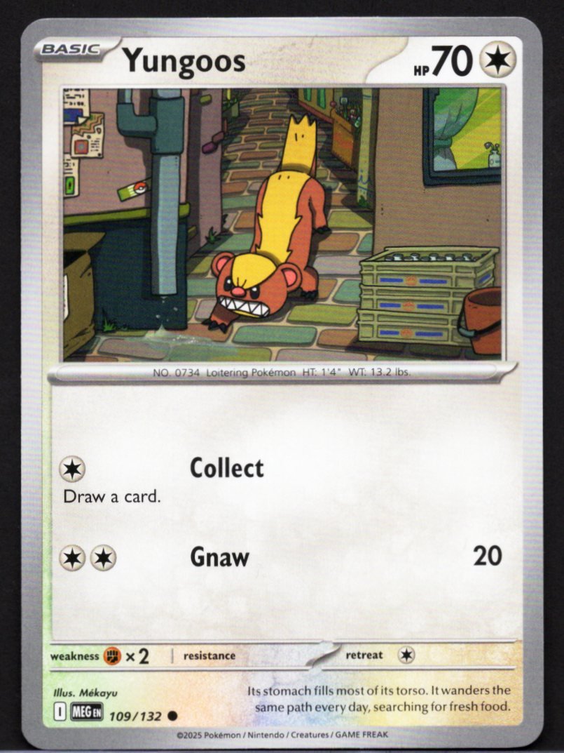 As a Colorless-type Pokémon, it can be easily integrated into any deck strategy for early-game support. Its primary utility comes from the Collect move, which allows the player to immediately draw a card from their deck to increase their hand size. For a direct physical strike, it can utilize the Gnaw attack to deliver reliable damage. The artwork by Mekayu perfectly captures the character’s focused and predatory nature, complemented by flavor text stating that its stomach fills most of its torso and that it wanders the same path every day searching for fresh food. The card also features standard game stats, including a specific weakness to Fighting-type attacks and a low retreat cost.