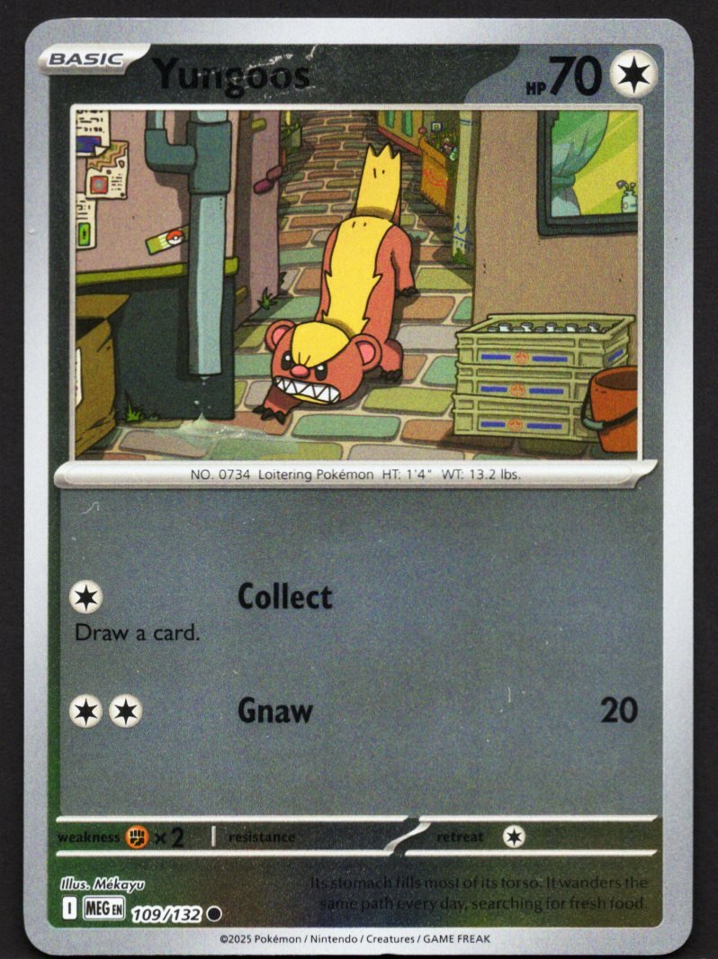 As a Colorless-type Pokémon, it can be easily integrated into any deck strategy for early-game support. Its primary utility comes from the Collect move, which allows the player to immediately draw a card from their deck to increase their hand size. For a direct physical strike, it can utilize the Gnaw attack to deliver reliable damage. The artwork by Mekayu perfectly captures the character’s focused and predatory nature, complemented by flavor text stating that its stomach fills most of its torso and that it wanders the same path every day searching for fresh food.