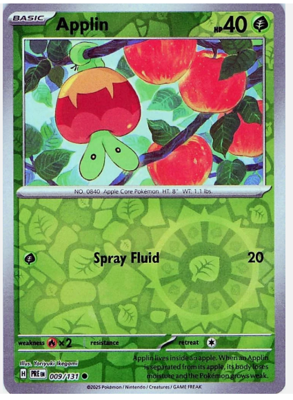 As a foundational Basic Pokémon, Applin offers straightforward utility. Its single attack, Spray Fluid (cost: one Grass Energy), deals 20 damage. While simple, its true value lies in its evolution potential into Flapple (with a Tart Apple) or Appletun (with a Sweet Apple).