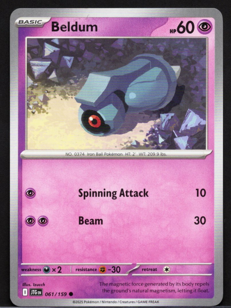 As a versatile Basic Pokémon, Beldum provides two attack options right from the start. Its first attack, Spinning Attack (cost: one Metal Energy), is a quick move that deals 10 damage. Its second attack, Beam (cost: one Metal Energy and one Colorless Energy), deals a more substantial 30 damage, offering a solid upgrade in power for a modest energy investment.