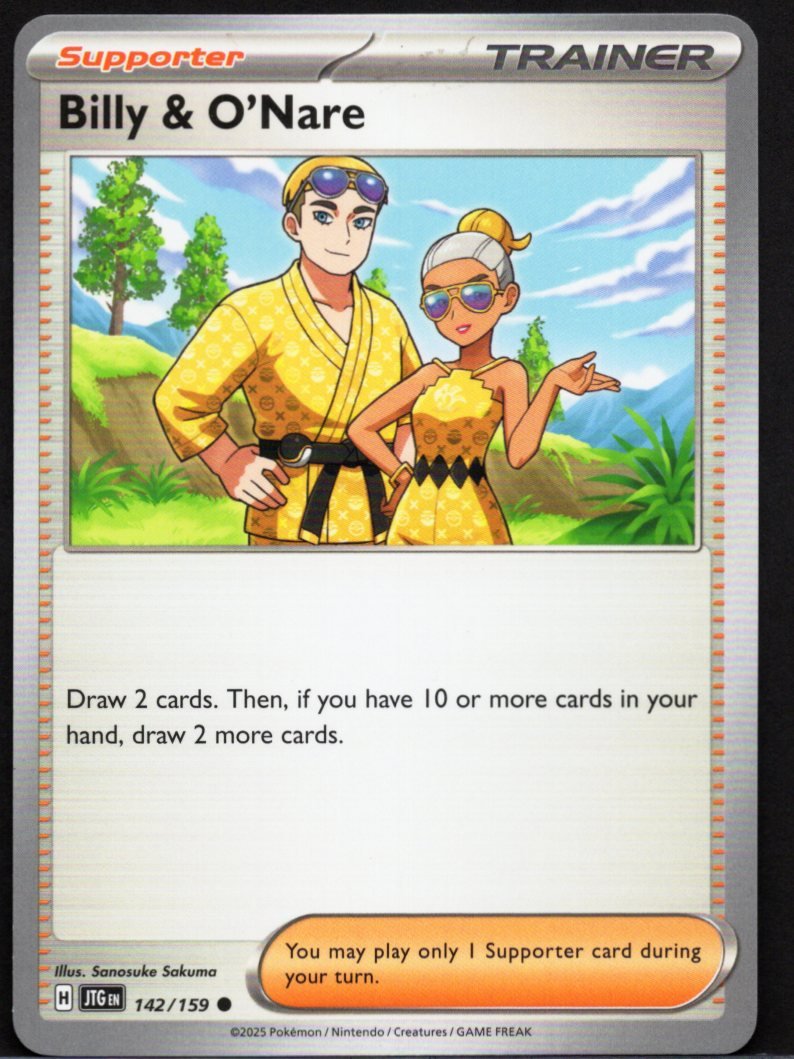 This official Pokémon Trading Card Game Supporter card features the dubious treasure-hunting couple, Billy & O’Nare. The expressive artwork by Sanosuke Sakuma captures the duo’s shifty and self-interested demeanor as they offer a deal that could greatly benefit a trainer with the right resources.