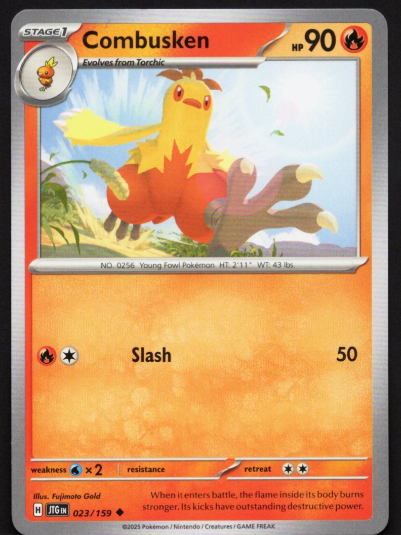 Classified as an Uncommon card (denoted by the diamond symbol), it has a robust 90 HP. It carries a Water-type Weakness (x2), no Resistance, and a moderate two-Colorless Energy Retreat Cost. As noted in its Pokédex entry, when Combusken enters battle, the flame inside its body burns stronger, and its kicks have outstanding destructive power—a perfect summary of its role as a reliable and aggressive mid-game attacker. This card is an essential evolution for any deck building the classic Torchic > Combusken > Blaziken line, offering a perfect balance of power and efficiency.