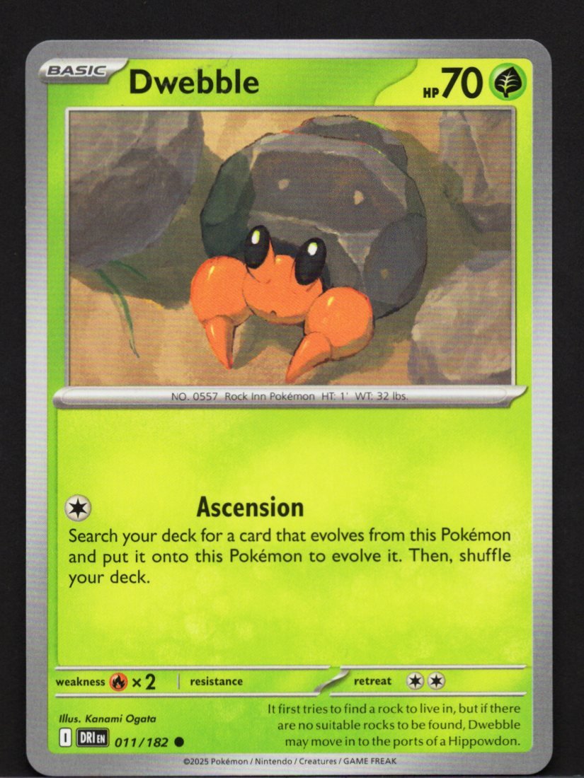 This official Pokémon Trading Card Game card features Dwebble, the ingenious Rock Inn Pokémon, as a Grass-type Basic Pokémon. The artwork by Kanami Ogata captures Dwebble’s unique biology, referencing its Pokédex habit of finding a rock to live in, or even moving into a Hippowdon’s ports if necessary.