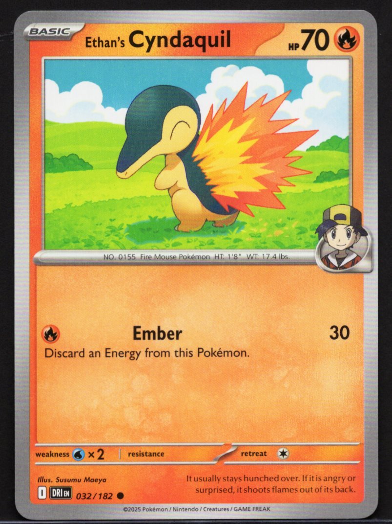 This official Pokémon Trading Card Game card features Ethan’s Cyndaquil, a variant of the beloved Fire Mouse Pokémon, as a Fire-type Basic Pokémon. The artwork by Susumu Maeya captures Cyndaquil’s timid, hunched-over posture, referencing its Pokédex behavior of shooting flames from its back when angry or surprised.