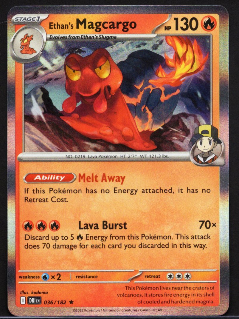 This official Pokémon Trading Card Game Holo card features Ethan’s Magcargo, a variant of the slow-moving Lava Pokémon, as a Stage 1 Fire-type Pokémon. The vibrant artwork by kodama showcases its magma-filled shell, referencing its Pokédex lore of living near volcano craters and storing fire energy within.