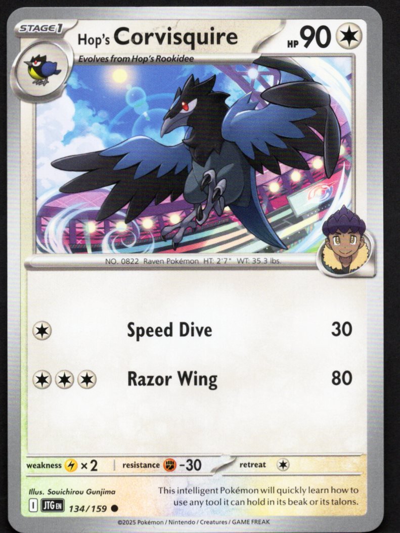 This official Pokémon Trading Card Game card features Hop’s Corvisquire, a variant of the clever Raven Pokémon, as a Stage 1 Colorless-type Pokémon. The detailed artwork by Souichirou Gunjima captures Corvisquire’s sharp and intelligent demeanor, reflecting its Pokédex entry which notes it can quickly learn to use any tool it holds in its beak or talons.
