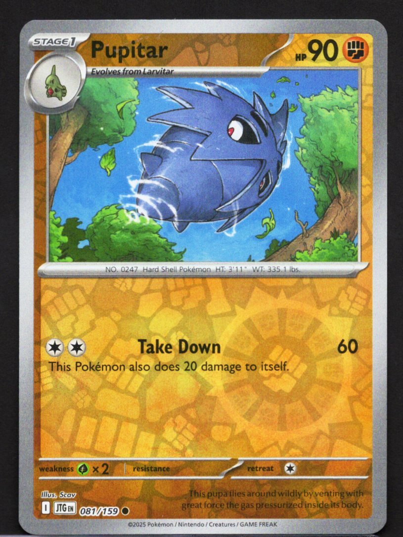 This official Pokémon Trading Card Game Reverse Holo card features Pupitar, the volatile Hard Shell Pokémon, as a Stage 1 Fighting-type Pokémon. The dynamic artwork by Scav captures Pupitar’s turbulent nature, likely mid-vent as it violently expels the pressurized gas that allows it to fly, perfectly illustrating the restless energy described in its Pokédex entry.