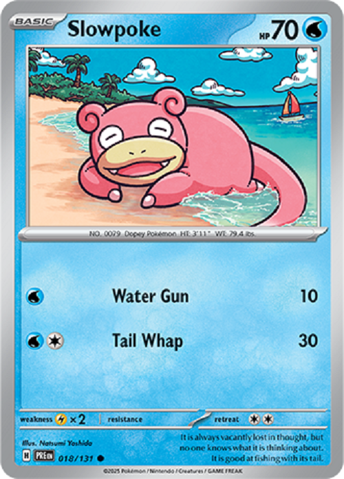As a Basic Pokémon, Slowpoke offers straightforward offensive options. Its first attack, Water Gun (cost: one Water Energy), deals 10 damage. Its second attack, Tail Whap (cost: two Water Energy), is a stronger move that deals 30 damage. These attacks provide reliable, if unspectacular, early-game pressure.