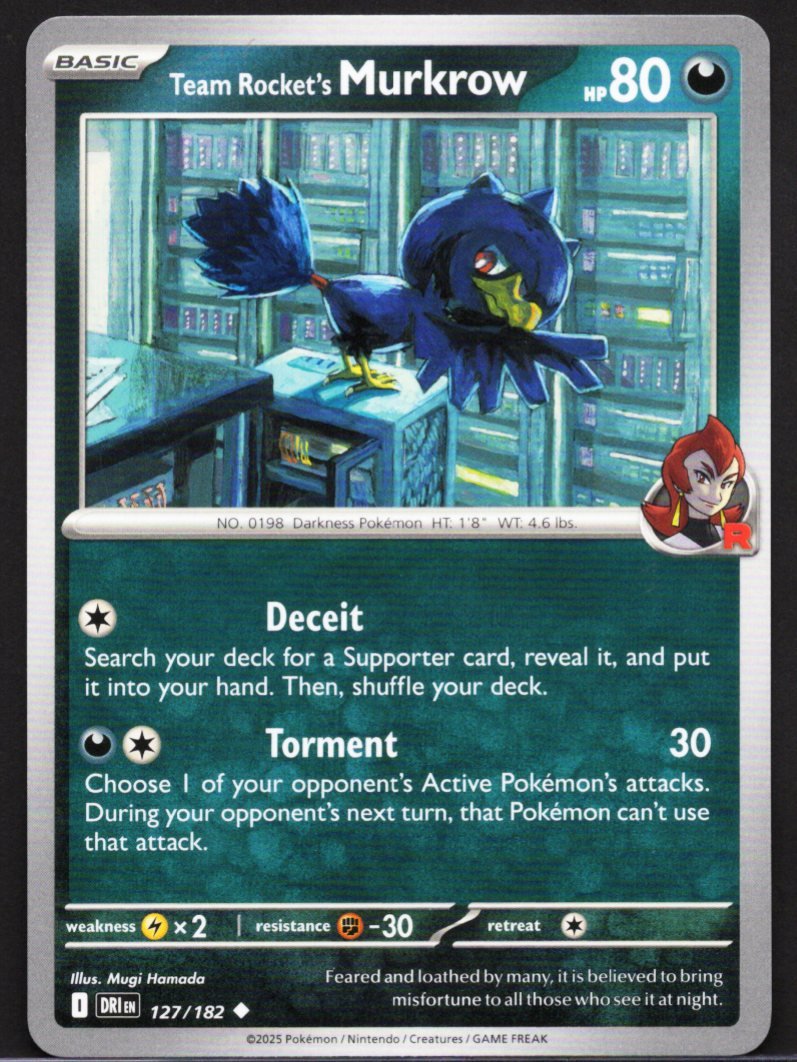 As a Basic Pokémon, Murkrow offers immediate strategic value with two disruptive attacks. Its first move, Deceit, allows you to search your deck for a crucial Supporter card and add it directly to your hand, accelerating your strategy. Its secondary attack, Torment, deals 30 damage and lets you cripple your opponent’s strategy by locking their Active Pokémon out of a specific attack during their next turn.