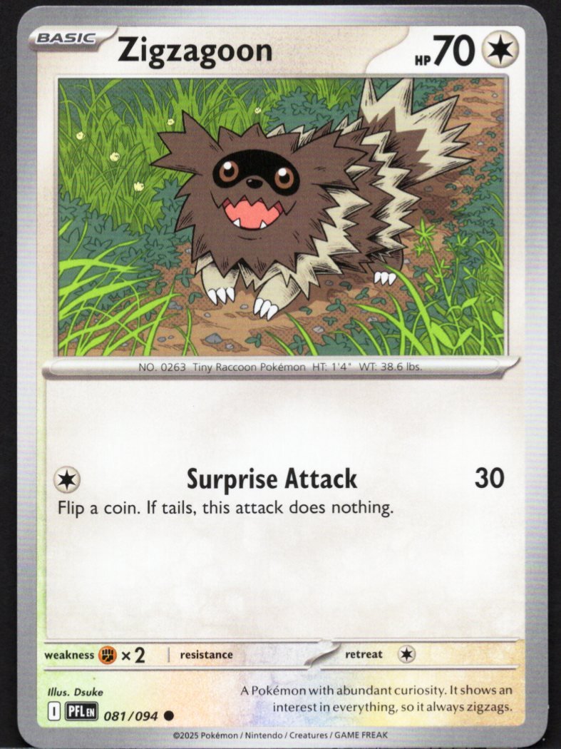As a Basic Pokémon, Zigzagoon provides an immediate offensive presence with a single, high-stakes move. Its primary attack, Surprise Attack, requires only a single Colorless energy card to execute. This move utilizes a simple coin-flip mechanic; if the result is heads, the attack deals a fixed amount of damage to the opponent’s Active Pokémon, but if the result is tails, the attack fails completely and deals no damage.