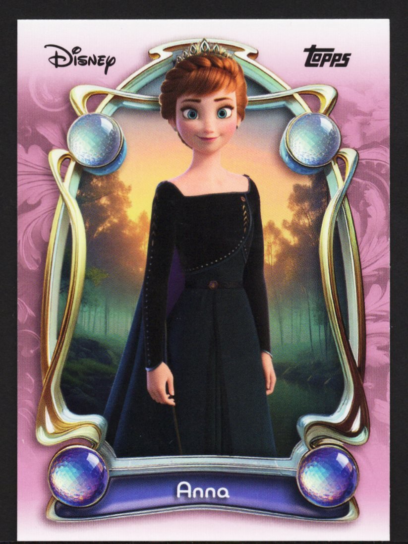This original Topps Disney Wonder Anna card is an essential collectible for fans of the Arendelle royal family and dedicated character collectors. Part of the tiered base set, the card depicts the courageous Anna in her elegant black and deep-purple travel gown, complete with her royal tiara. Her warm smile and poised stance perfectly capture the character’s journey from a spirited princess to a wise and loving queen. The character is beautifully framed by the collection’s signature ornamental golden and pink border, set against a glowing forest background that highlights her role as a symbol of hope and perseverance. Manufactured by Topps on high-quality card stock, this English-language card offers a premium feel and vibrant color reproduction. Whether you are a set builder working through the tiered checklist or a fan of the epic story of sisterly bonds, this card is a magnificent addition to any collection.