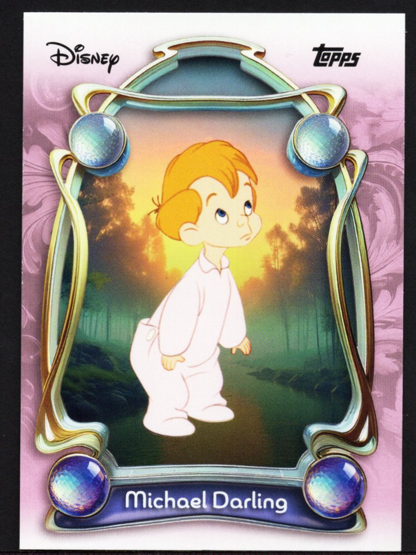 This original Topps Disney Wonder Michael Darling card is a charming addition for collectors of Peter Pan memorabilia and fans of Disney’s classic storytelling. Part of the Tier 1 base set, the card features a vibrant illustration of the youngest Darling brother looking up with a wide-eyed, innocent expression as he prepares for his journey to Neverland. The artwork is framed by the collection’s distinctive ornamental golden and pink border, set against a warm, sun-drenched forest background that captures the adventurous spirit of the film. Manufactured by Topps on high-quality 35 Pt card stock, this English-language card offers the premium feel and durability standard for the modern Disney Wonder series. As one of the early cards in the expansive tiered base set, it is a key piece for those working to complete a full character set or for anyone looking to highlight the endearing companions of the Disney universe.