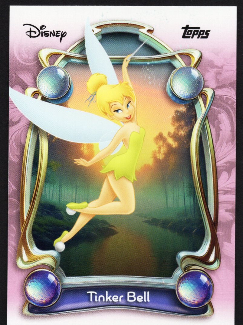 This original Topps Disney Wonder Tinker Bell card is a captivating collectible for fans of the “pixie dust” magic and Disney’s legendary animation history. As a prominent character in the tiered base set, the card depicts Tinker Bell in her classic green dress, captured in mid-flight with a joyful expression and her magic wand raised. The illustration is framed by the series’ signature golden and pink ornamental border, set against a glowing forest backdrop that highlights her role as a symbol of discovery and joy. Manufactured by Topps on high-quality 35 Pt card stock, this English-language card delivers a premium look and feel that is ideal for display. Whether you are a dedicated set builder working through the expansive tiered checklist or a fan of the sassy and helpful spirit from Neverland, this card is a must-have piece of Disney artistry.