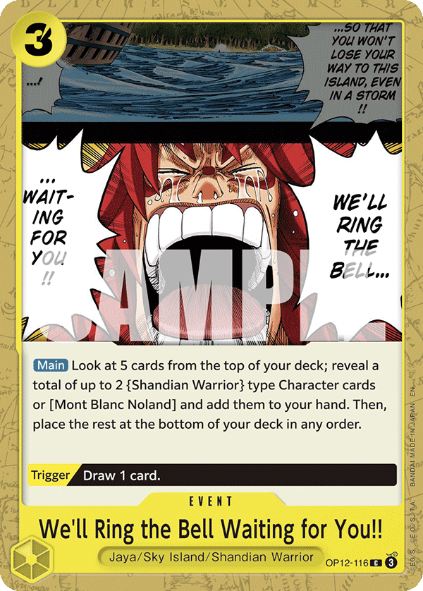 This original One Piece Card Game card features the emotional We’ll Ring the Bell Waiting for You!! event, associated with the Jaya, Sky Island, and Shandian Warrior types. The card showcases a powerful, multi-paneled illustration of the Great Warrior Kalgara crying out in grief and hope, alongside a depiction of a ship sailing away through a storm, capturing the promise to guide his friend back to the island.